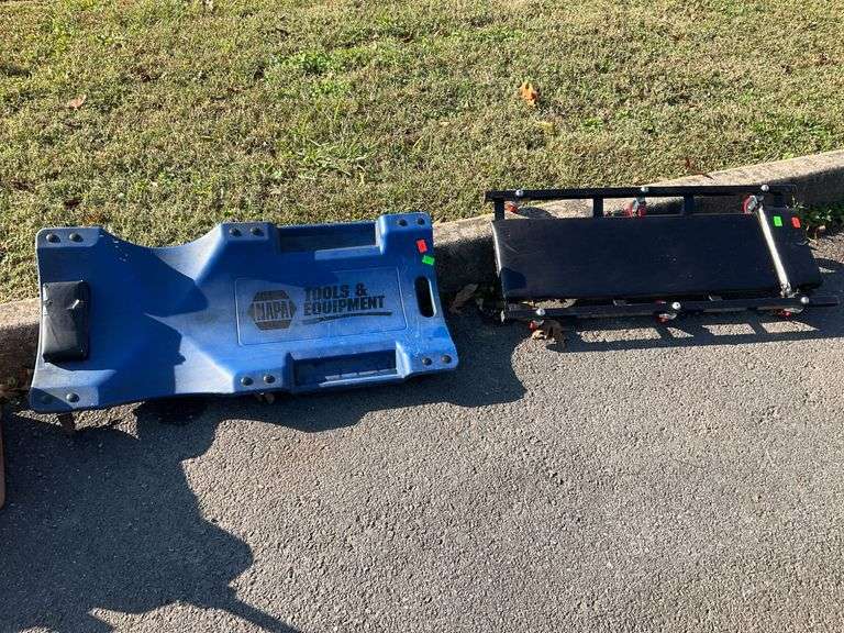Two mechanics creepers showing signs of prior use. Includes a blue plastic NAPA Tools & Equipment creeper with handles and a black cushioned creeper on a metal frame with caster wheels.