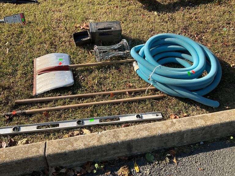 Includes one level, a coiled blue pool tube, a set of tire chains, a metal head shovel with a long handle, and additional tools, as shown. Items are laid out on a grass surface. Assorted types and materials present within the lot.
