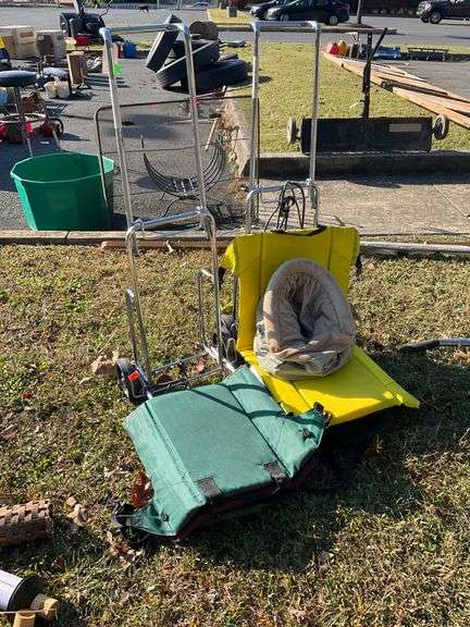 Includes two folding luggage dollies designed for transport, accompanied by two padded seat covers—one yellow and one green. Also includes a cloth bag for additional utility. Constructed with metallic frames and equipped with durable wheels for mobility.