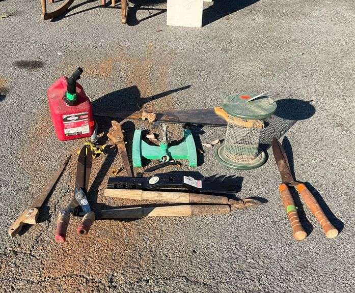 Outdoor tools and accessories including a 1-gallon red plastic fuel can, a green metal/wood bird feeder, green lawn sprinkler, tree limb loppers with wood handles, and additional saws and gardening tools. Items sold as a lot.