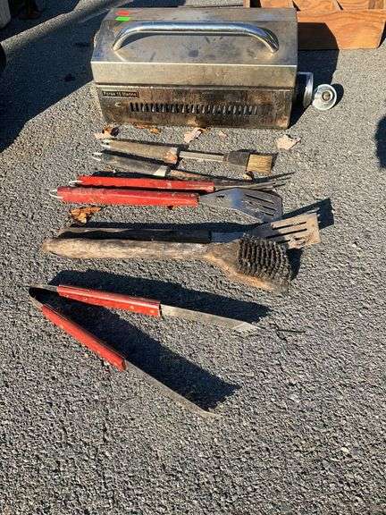 Force 10 Marine propane cylinder tabletop grill featuring a 16-inch cooking surface. Includes a collection of grilling tools such as tongs, cleaning brush, spatula, and skewers. The grill is portable and has a handle and wheel for mobility. The item is non tested by Hash Auctions.