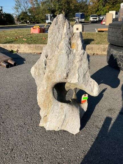 Irregularly shaped garden rock featuring a textured surface with carved openings, creating a visually dynamic profile. Stands 22 inches tall. Designed to complement outdoor spaces with a natural and artistic aesthetic.