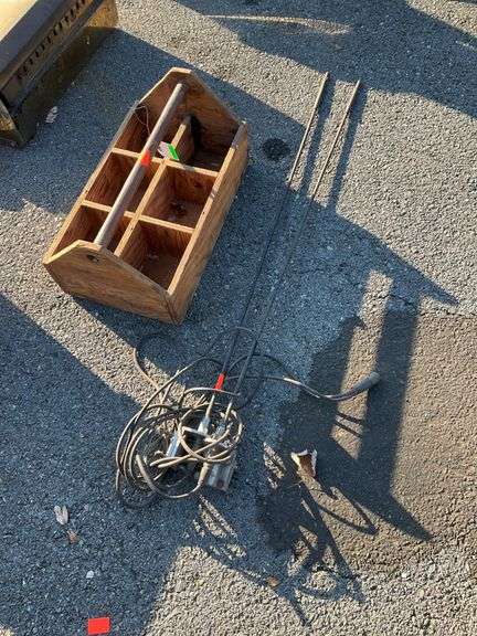 Wooden divider tray featuring multiple compartments and a central handle. Includes two long antennas with attached cables. Antennas appear to be metal construction.