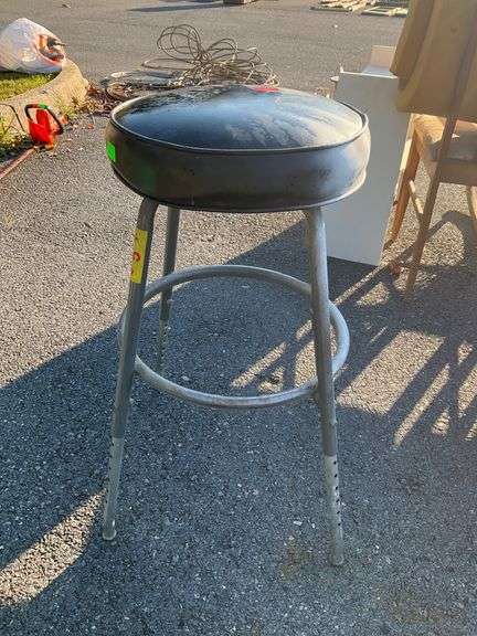 Barstool featuring a padded round seat and a sturdy metal frame. Includes a built-in circular footrest. Seat height measures 27” from floor.