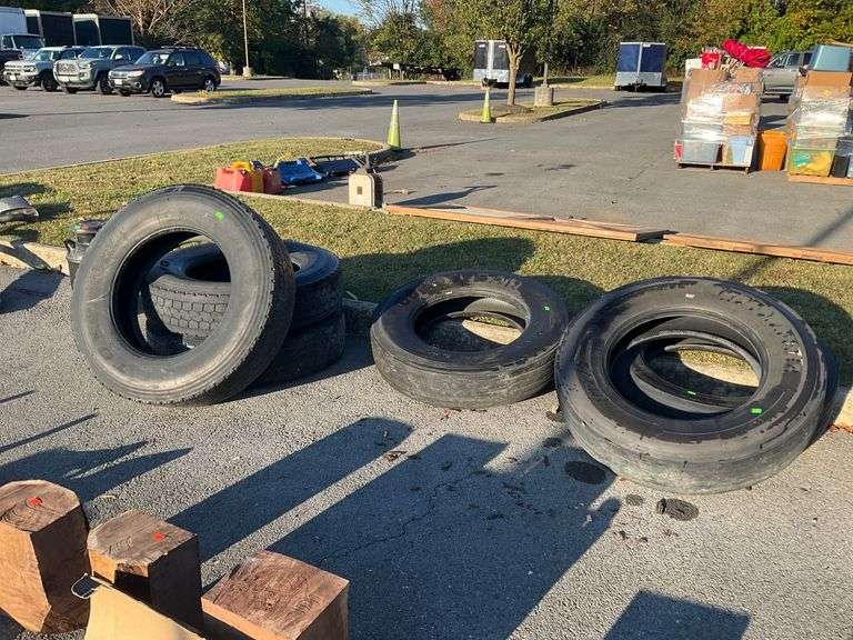 Six used tires, all with 11R24.5 dimensions as marked. Brands vary across the set. Visible signs of prior use are present, including wear and tread variations across the tires.