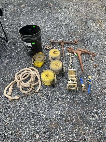 Includes multiple ratchet straps with yellow webbing, a set of ratchet binders with chain components, and braided rope pieces with attached hardware. Items show typical use-related marks. Sold as a group.