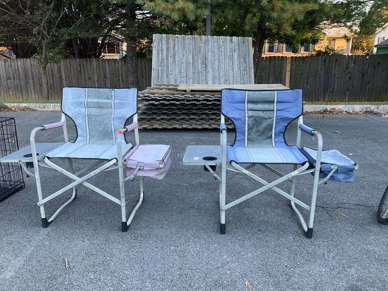 Two outdoor folding camping chairs featuring integrated cupholder side tables and cloth side bags. Side bags are insulated with an interior lining. Chairs have tubular frames and fabric seating. Variations in color are blue and light gray.