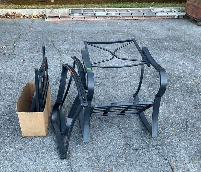 Includes disassembled components for an aluminum rocking chair and a glass top table. No hardware is included with the lot. The chair and table frames feature a black aluminum finish. Sold as is, requires assembly.