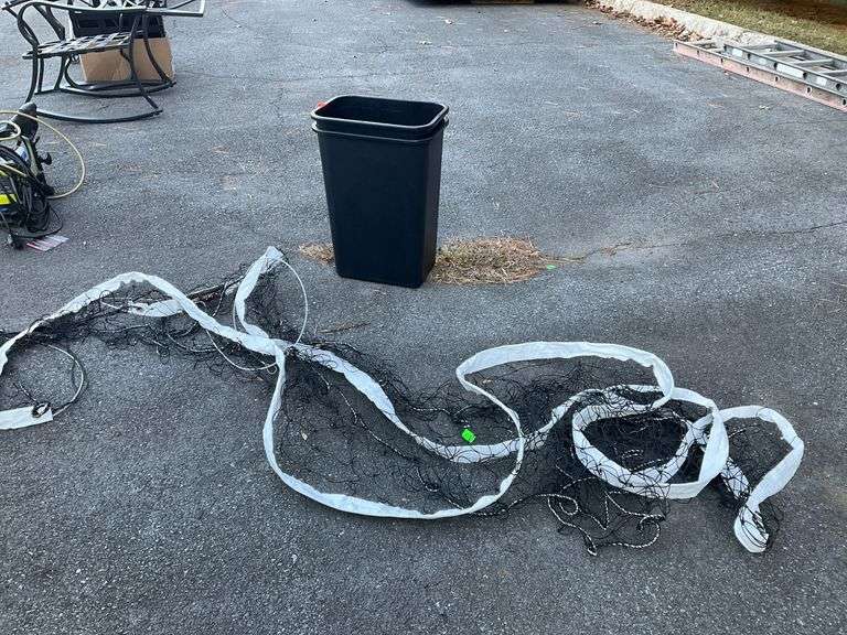 Includes two durable black plastic trash bins and a separate sports net with mesh and white trim. The trash bins feature a stackable design for space efficiency.