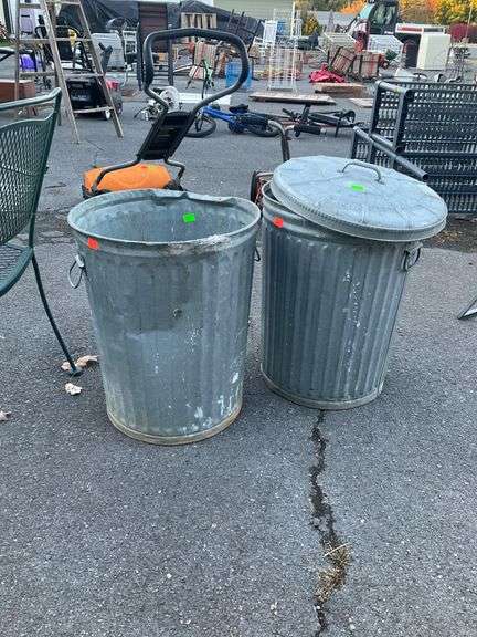 Two galvanized trash cans featuring ridged sides for added structural integrity. One can includes a fitted lid with an integrated handle. Dimensions are 21 inches deep by 16 1/2 inches in diameter.
