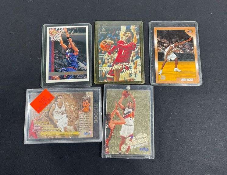 Five basketball trading cards featuring various players in protective sleeves. Cards show players in action as well as rookie editions. Makers and brand logos visible on the cards include Topps and UD. Presented as a group.