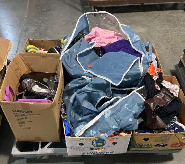 Pallet lot featuring a variety of items, including clothing in different colors and types, multiple pairs of shoes, various bags, and miscellaneous textiles. Items are organized in open boxes and a fabric storage bag. Contents appear varied and unsorted. Pallet will be located outside and cove to the best of our abilities, buyer of pallet takes all contents.