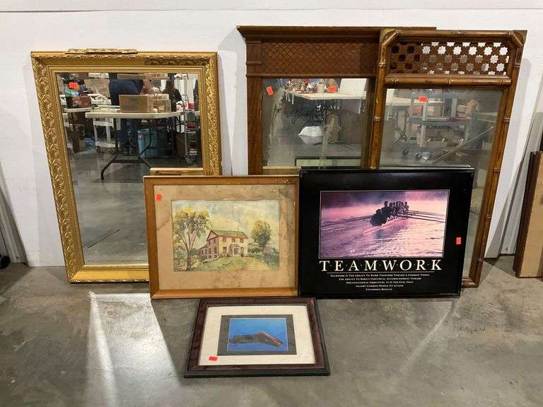 Group of mirrors and frames, includes rectangular wall mirror measuring 36×30 with a silver-tone reflective surface. Back panel is shown in a dark matte finish. The frame showcases a clean-lined, modern appearance. Some surface marks and wear are visible upon close inspection. Other items show wear and debris from storage. Pallet will be located outside and cove to the best of our abilities, buyer of pallet takes all contents.