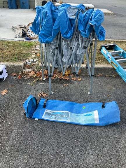 Collapsible slant wall canopy measuring 10'x10', featuring a blue fabric top supported by a metal frame. Includes a coordinating blue storage bag with a pre-attached product information label. Compact design for transportability. There are some holes from prior use, this lot is sold as-is.