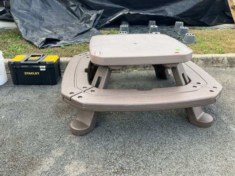 Brown plastic picnic table by Little Tikes featuring a square top with integrated seating benches. Designed with durable molded plastic construction. Built-in cupholders visible on the benches. Suitable for indoor or outdoor use.