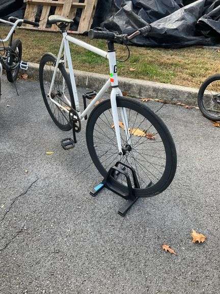 Fixed-gear bicycle featuring a 63cm white frame and black tires. Minimalist design with a single gear setup and a rear brake. Includes platform-style pedals, a standard saddle, the bike stand seen in photo is not part of the lot.