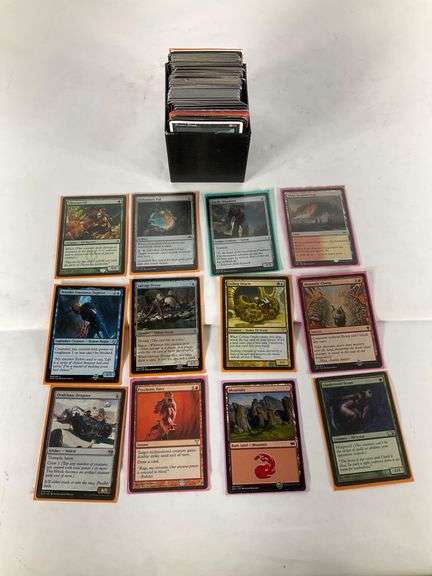 Magic: The Gathering trading cards from various years. Includes numerous cards featuring a variety of artwork, abilities, and expansions. Cards are presented with some in protective sleeves. Exact card details and quantities as shown in images.