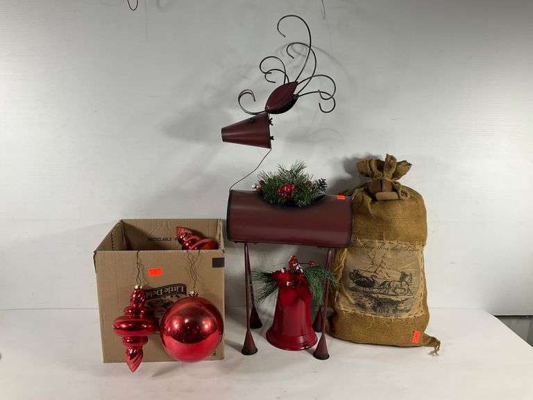 Holiday decor featuring a metal reindeer planter with artificial greenery, red hanging ornaments in various shapes, a red bell with floral accents, and a burlap sack with printed winter scene artwork. Includes a mix of decorative pieces for festive settings.
