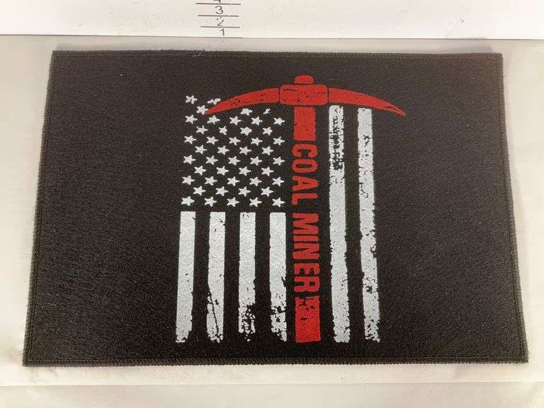 A 27x18in black mat featuring an American flag motif integrated with the depiction of a red pickaxe and vertical text reading 'Coal Miner.' Constructed with textured material and bordered edges.