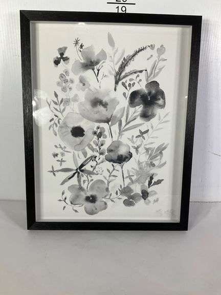 Monochromatic floral artwork featuring flowers and leaves in a grayscale palette. Signed by the artist in the lower right corner. Encased in a black frame. Frame dimensions measure 15 x 19 inches. Manufactured in March 2023.