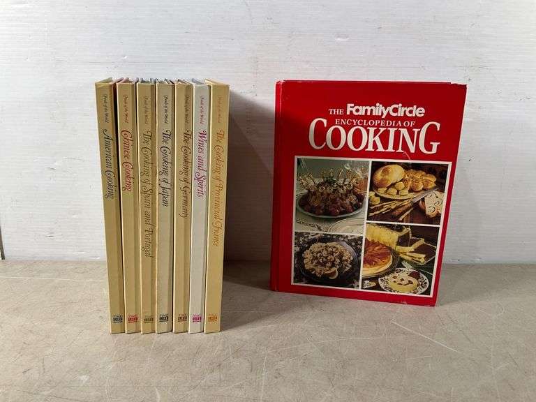 Collection includes the red hardcover 'Family Circle Encyclopedia of Cooking' and six paperback volumes from the Time-Life 'Foods of the World' series: American Cooking, Chinese Cooking, Cooking of Spain and Portugal, Cooking of Japan, Cooking of Germany, and Wines and Spirits.
