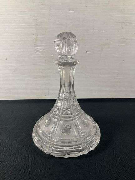 Cut crystal decanter featuring an intricate geometric and starburst design on the body and base. Includes a matching faceted stopper with a rounded top. Overall dimensions are 7×10.5”.