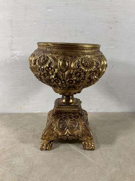 Decorative vessel made of metal with brass finish featuring elaborate floral and scrollwork relief patterns. The piece rests on a pedestal base with clawed feet, enhanced by intricate detailing. Hollow interior visible from the open top. Measures 9.5″x7″.