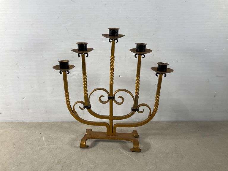 A wrought iron candelabra featuring five candle holders arranged in a tiered design. Includes twisted column supports and decorative scrollwork details. The piece stands on a sturdy base with curved feet, measuring 15 inches in height.