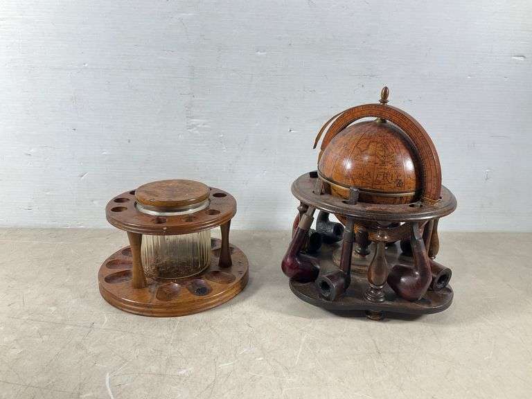 A globe-shaped pipe holder with compartments for 8 pipes, featuring a hinged lid that opens to reveal an internal tobacco storage container, showing a map design. Accompanied by a round pipe stand with glass jar for tobacco storage and multiple pipe slots.