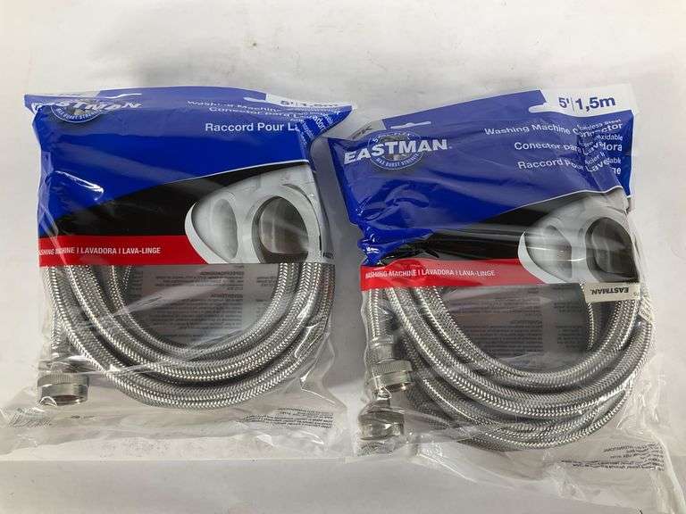Two packs of Eastman washing machine connectors, each containing a 5 ft (1.5 m) stainless steel hose. Designed for use with washing machines. Each pack includes two hoses, featuring standard threaded connections for easy installation.