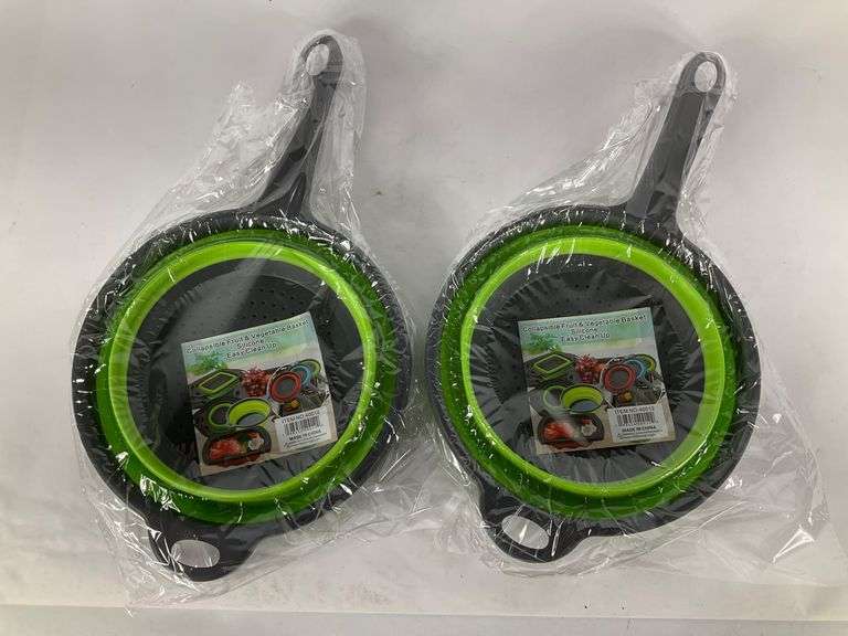 Two collapsible strainers made of silicone with integrated handles. Features perforated bases for efficient draining and a green and black color scheme. Compact design allows for folding and easy storage. Made in China.