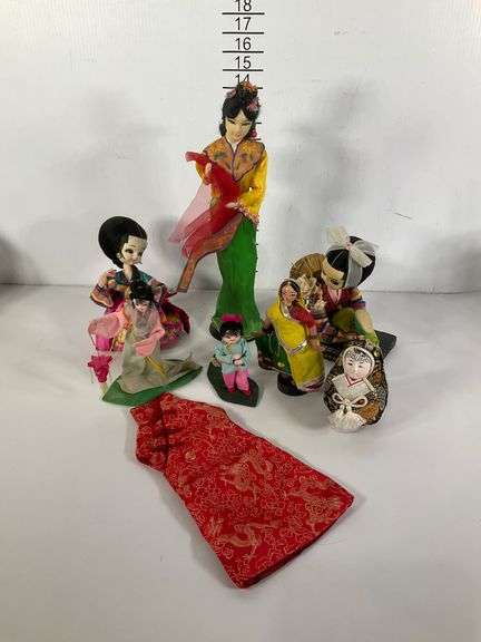Dolls and figurines depicting traditional Asian attire and cultural themes. Includes various materials and styles, with at least one piece marked ‘Made in Japan’. Additional clothing accessory in red fabric is included.