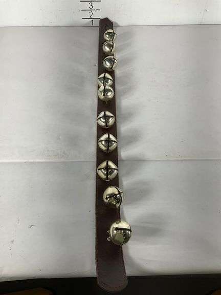 A strap crafted featuring multiple attached sleigh bells. The strap includes holes, and the bells are securely fastened along its length. The bells produce sound when shaken. Suitable as a functional or decorative piece.