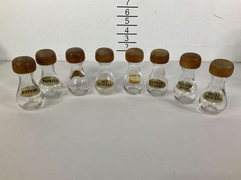 Eight clear glass jars featuring wooden lids and printed labels for spices such as Nutmeg, Paprika, Dry Mustard, and Chili Powder. One jar shown with a perforated glass shaker insert. Labels exhibit slight wear. Functional and decorative storage items.