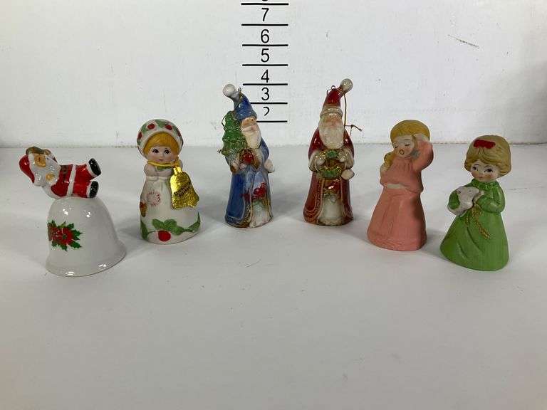 Six porcelain bells featuring various hand-painted designs, including Santa Claus figures, a young girl with a golden tag labeled ‘Strawberry Patches,’ and other festive characters. Some include gold hanging loops. Interiors have clapper mechanisms intact.