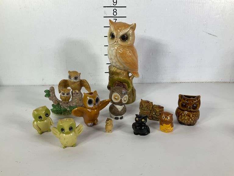 Owl figurines crafted from ceramic and porcelain, including detailed designs and painted finishes. Several pieces bear marks indicating manufacture in Japan and Taiwan, with one labeled “Napco.” Varied sizes and styles within the collection.
