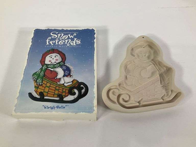 Ceramic cookie mold from the 1998 Longaberger Pottery Snow Friends series, featuring a snowman design on a sled. Includes the original box with baking instructions on the back. Mold has an embossed Longaberger logo and 1998 copyright on the back.