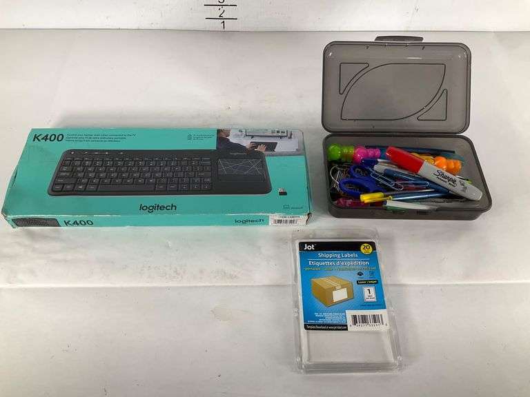 A Logitech K400 wireless keyboard with box and packaging, a plastic storage case containing various stationery supplies such as markers, pens, and clips, and a pack of Jot permanent shipping labels (4 x 6 inches, compatible with laser/inkjet printers) shipping labels not complete.