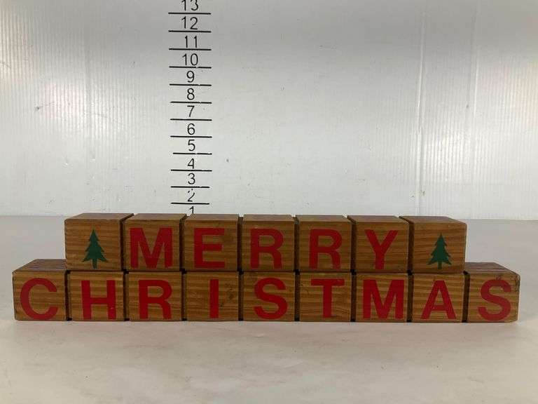 Block decorations featuring interchangeable holiday-themed messages, including ‘Merry Christmas,’ ‘Easter Greetings,’ ‘Welcome Friends,’ and ‘Be My Valentine.’ Each block has painted lettering and small decorative icons such as trees, rabbits, and hearts.