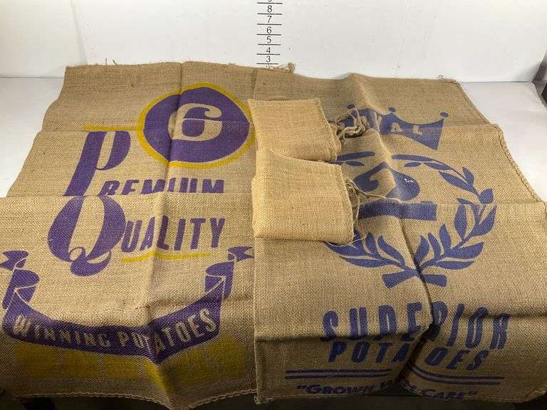 Two burlap sacks featuring printed graphics and text reading ‘Premium Quality’ and ‘Superior Potatoes’ along with two smaller burlap sacks. Both larger sacks display purple and yellow prints, showing agricultural branding. Smaller sacks are unprinted.