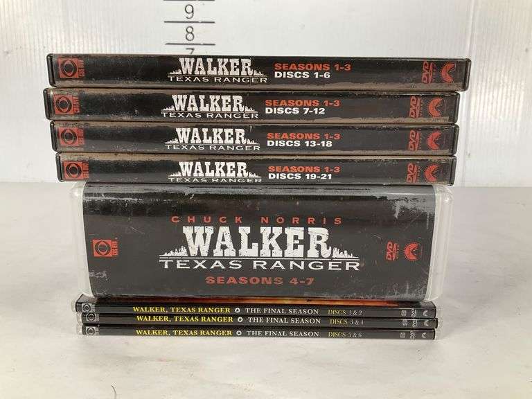Complete DVD series of ‘Walker, Texas Ranger,’ featuring seasons 1–9. Includes multiple disc sets: seasons 1–3, 4–7, and 8–9 (final season). Boxed artwork and labeling match the series theme.