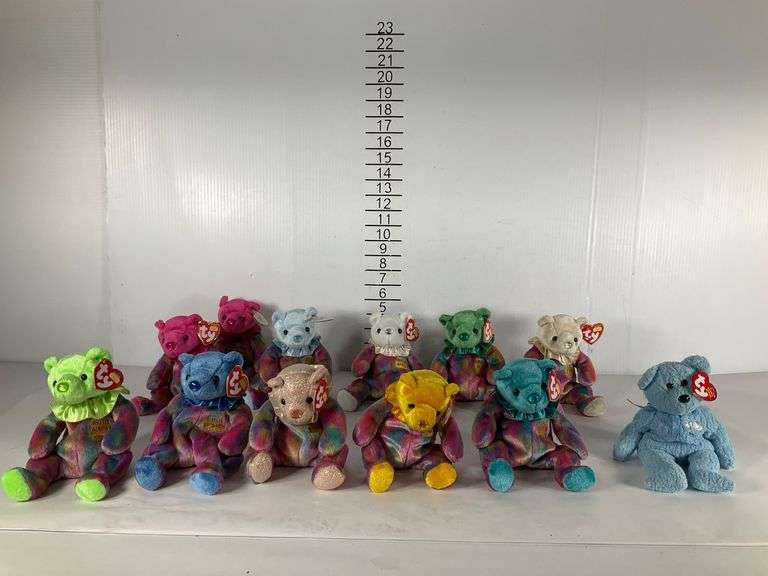Ty Beanie Baby bears featuring multi-colored fur, various designs, and attached Ty tags. Two months missing from the set (February and July). Includes bears with ruffled necks and assorted vibrant hues.