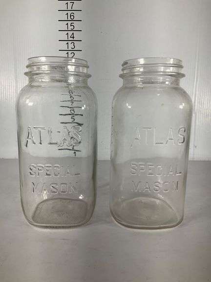 Two Atlas Special Mason glass jars with embossed lettering on the front. Each jar has a half-gallon capacity and threaded openings for lids. Both jars show clear glass construction.