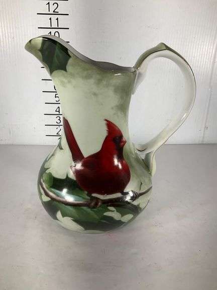 A pitcher from the Hautman Brothers Collection featuring a cardinal and holly motif. Marked on the base with branding details, including ‘Living Quarters’ and ‘Hand Wash Recommended.’ Made in China and licensed by MHS Licensing.