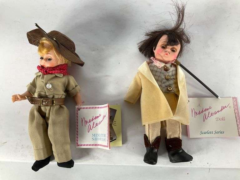 Two Madame Alexander dolls, including ‘Australia’ from the Miniature Showcase and ‘Rhett’ from the Scarlett Series. Each doll features detailed clothing and an attached tag. Both are marked ‘Made in USA.’ Conditions as shown.
