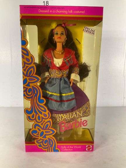Mattel Special Edition Italian Barbie Doll from the Dolls of the World Collection. Features Barbie dressed in traditional Italian-style attire with accessories. Housed in original packaging with illustrative details specific to the collection.
