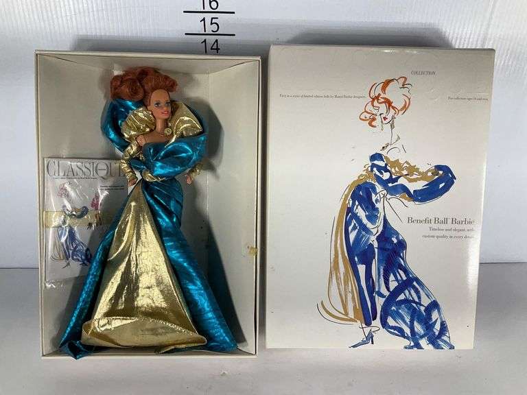 Mattel Barbie Classique Collection Benefit Ball Doll wearing a teal and gold gown, styled with elaborate red hair. Includes original box featuring printed artwork and an accompanying Classique pamphlet. Box shows visible wear. Release year and additional details marked on the packaging.