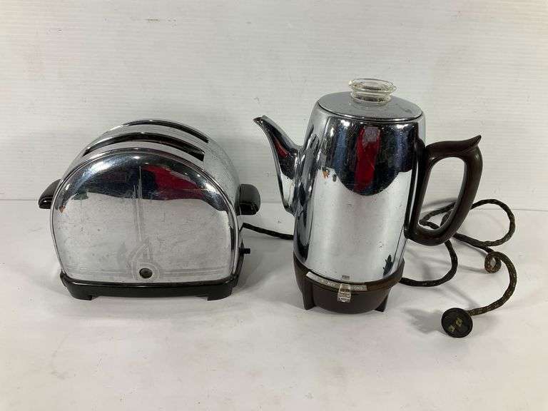 Includes a Sunbeam toaster with a two-slot design and black accents, along with a General Electric electric coffee percolator featuring a chrome body, glass knob, and brown handle. Both items have visible electric cords with older-style plugs.