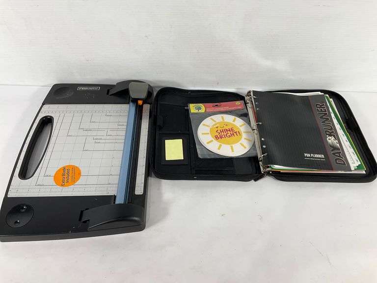 Includes a Fiskars paper cutter with integrated gridlines and a cutting blade, a zippered Day Runner PDA planner with organized inserts and dated calendar pages, and a pack of Teaching Tree ‘Shine Bright!’ large foil classroom decorations.