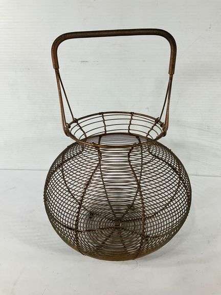 Spherical metal wire basket featuring a woven design and integrated handle. The basket includes a hinged structure allowing for expansion or collapsibility. Displays a utilitarian yet decorative design.